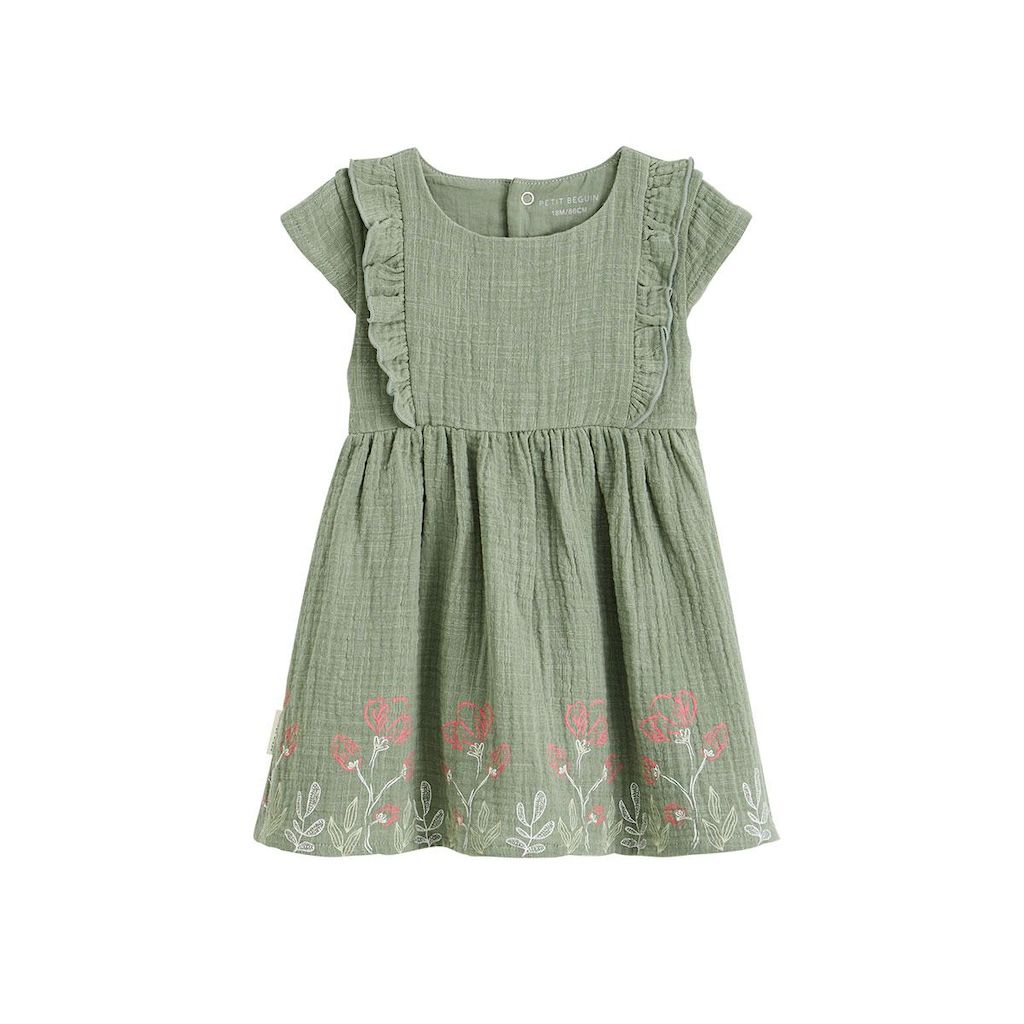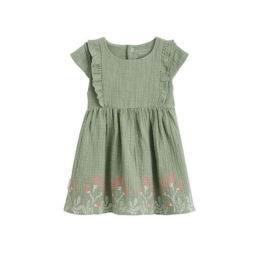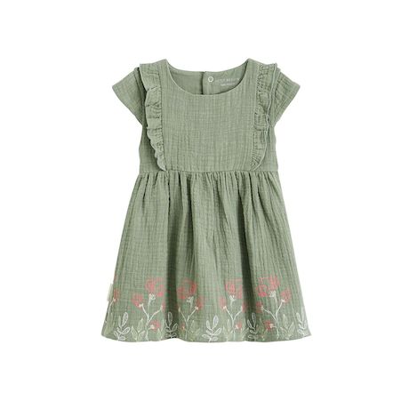 Cette robe kaki mise sur les détails qui font fondre, avec ses volants délicats, ses imprimés fleuris dans le bas de la robe et sa coupe confortable. Une pièce pleine de charme, idéale pour accompagner votre petit bout tout en douceur. En gaze de coton trop confort Jolis volants aux épaules Photos n