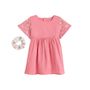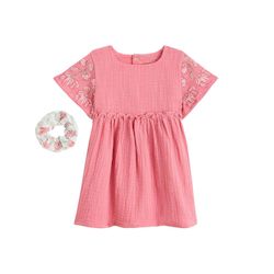 Cette robe rose grenadine nous fait fondre avec sa coupe fluide et ses jolis détails. Les fleurs brodées sur les manches apporte du style, tandis que le chouchou assorti complète la tenue avec une touche encore plus mignonne. Un ensemble plein de charme, facile à porter au quotidien. En gaze de coto