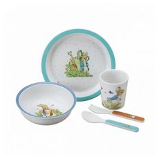 Dès 6 mois. Un joli set de 5 pièces, avec rebords ergonomiques pour aider l'enfant à prendre les aliments et manger presque tout seul. Composé d'une assiette, d'un bol, d'une timbale et d'un set de 2 couverts. Dimensions : boite : 19,5 x 19,5 x 8 cm / bol : 250 ml / timbale : 160 ml. Conseils d'entretien : lavable en machine. Ne pas utiliser au micro-ondes, ni au congélateur. Laver avant la première utilisation.