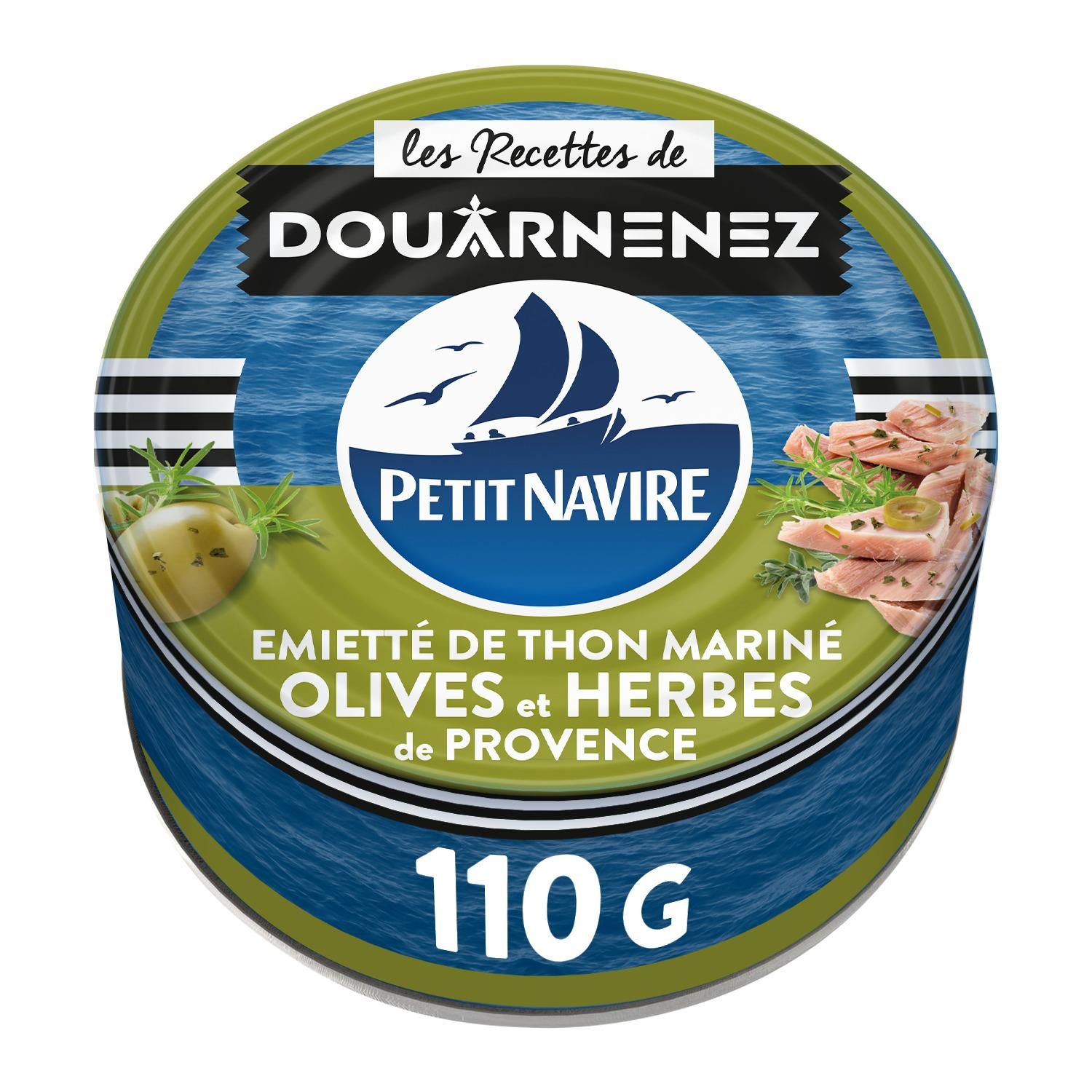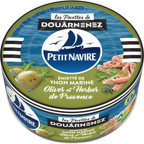 THON (80%), huile d'olive vierge extra, eau, olives (3,7%), huile de tournesol, herbes de Provence (0.6%), sel, jus de citron concentré, poivre noir, épaississant : gomme guar.
