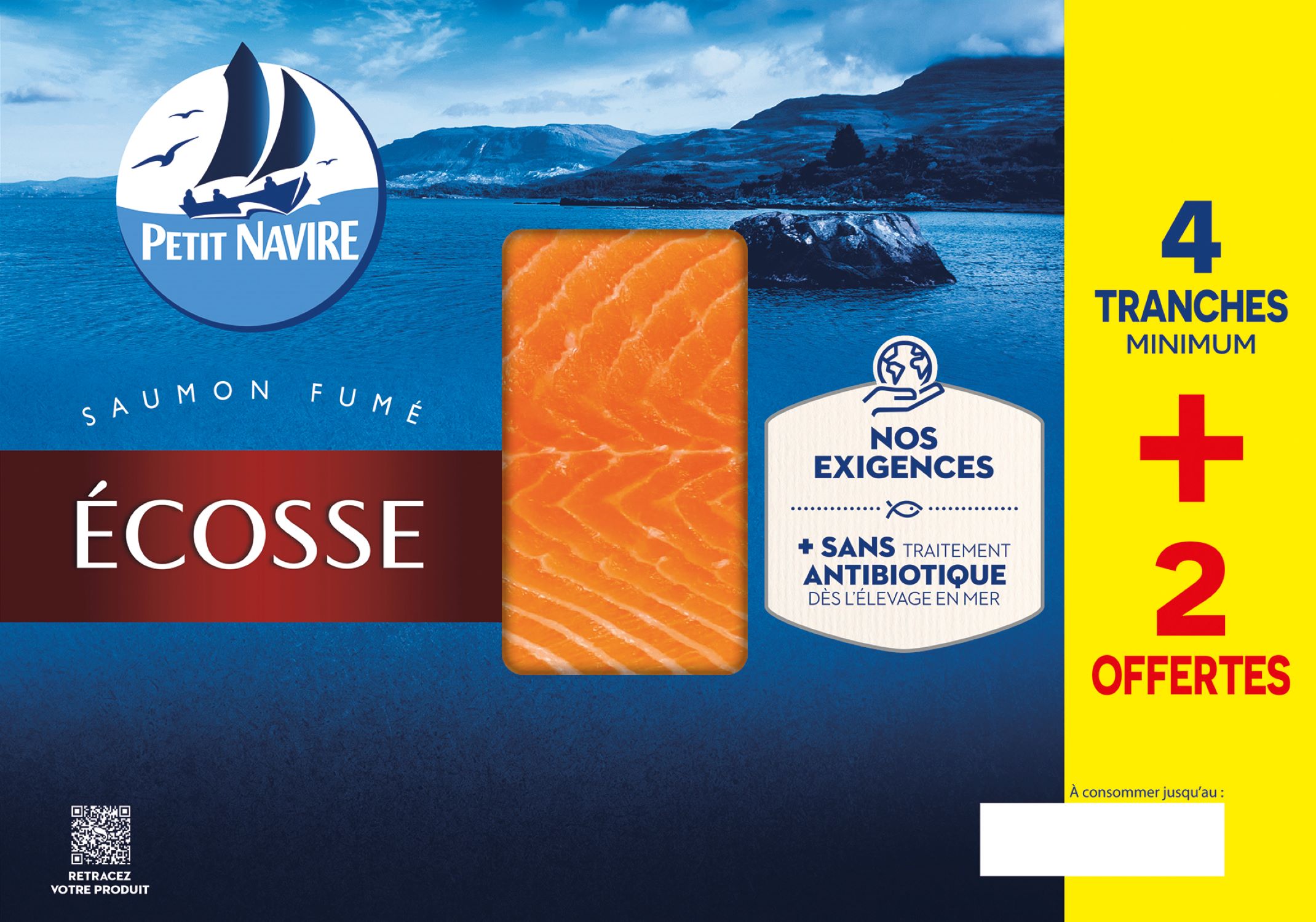 SAUMON ATLANTIQUE ELEVE EN ECOSSE FUME 4T + 2T OFFERTES MINI 160G PETIT NAVIRE