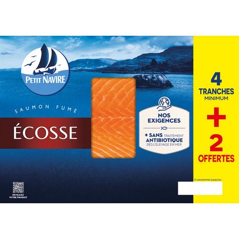 SAUMON ATLANTIQUE ELEVE EN ECOSSE FUME 4T + 2T OFFERTES MINI 160G PETIT NAVIRE Tranches de saumon Atlantique, élevé en Ecosse (Royaume-Uni), fumé. Produit décongelé, ne pas recongeler