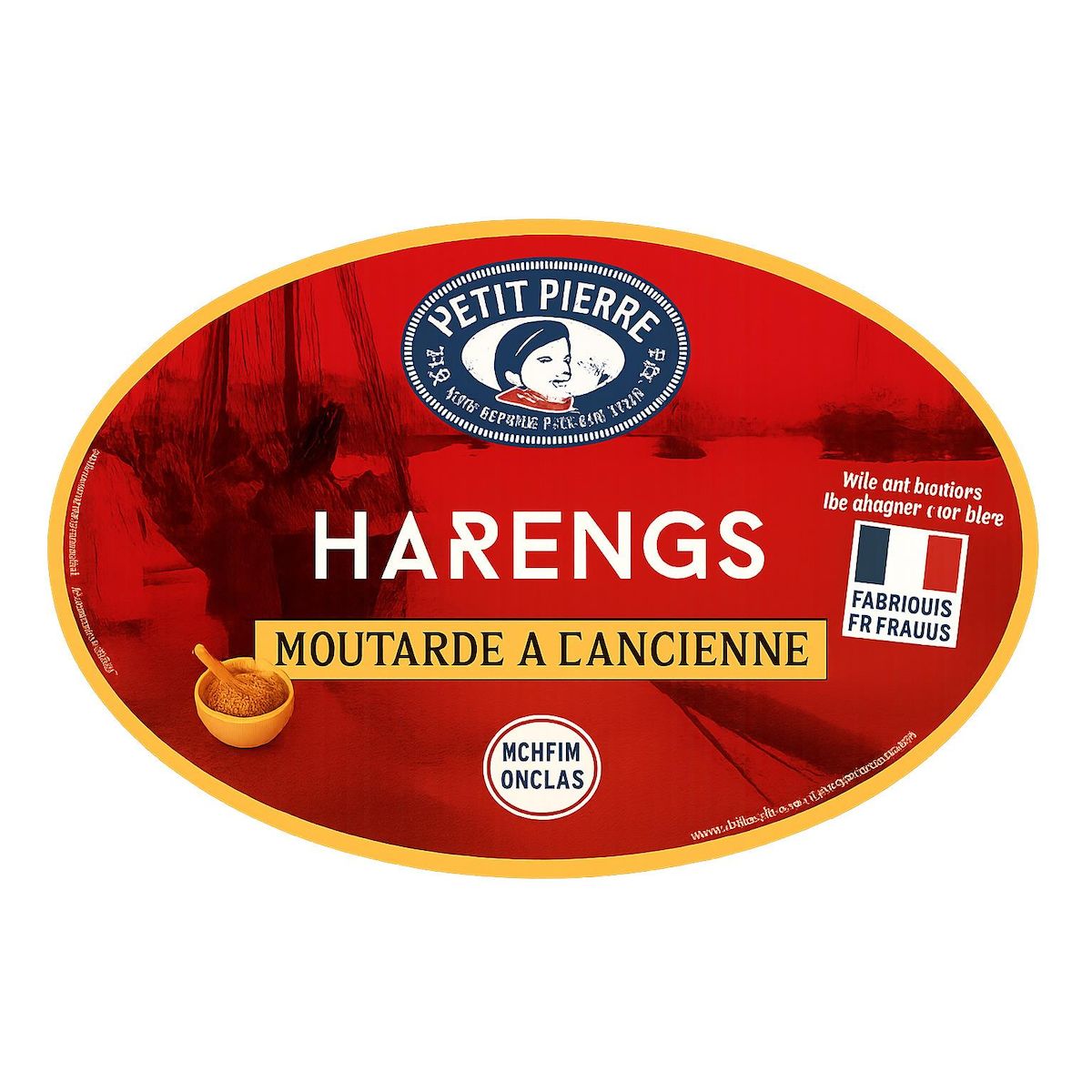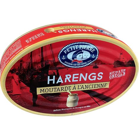 HARENGS 70%, eau, MOUTARDE de Dijon 6% (eau, graines de MOUTARDE , vinaigre d'alcool, sel), huile de colza , MOUTARDE à l'ancienne 3.3% (eau, graines de MOUTARDE , vinaigre d'alcool, sel), vinaigre d'alcool, sel, sucre, amidon transformé de maîs, vin blanc, arôme naturel, curcuma, arôme naturel de poivre, épaississant : gomme guar, gomme xanthane.