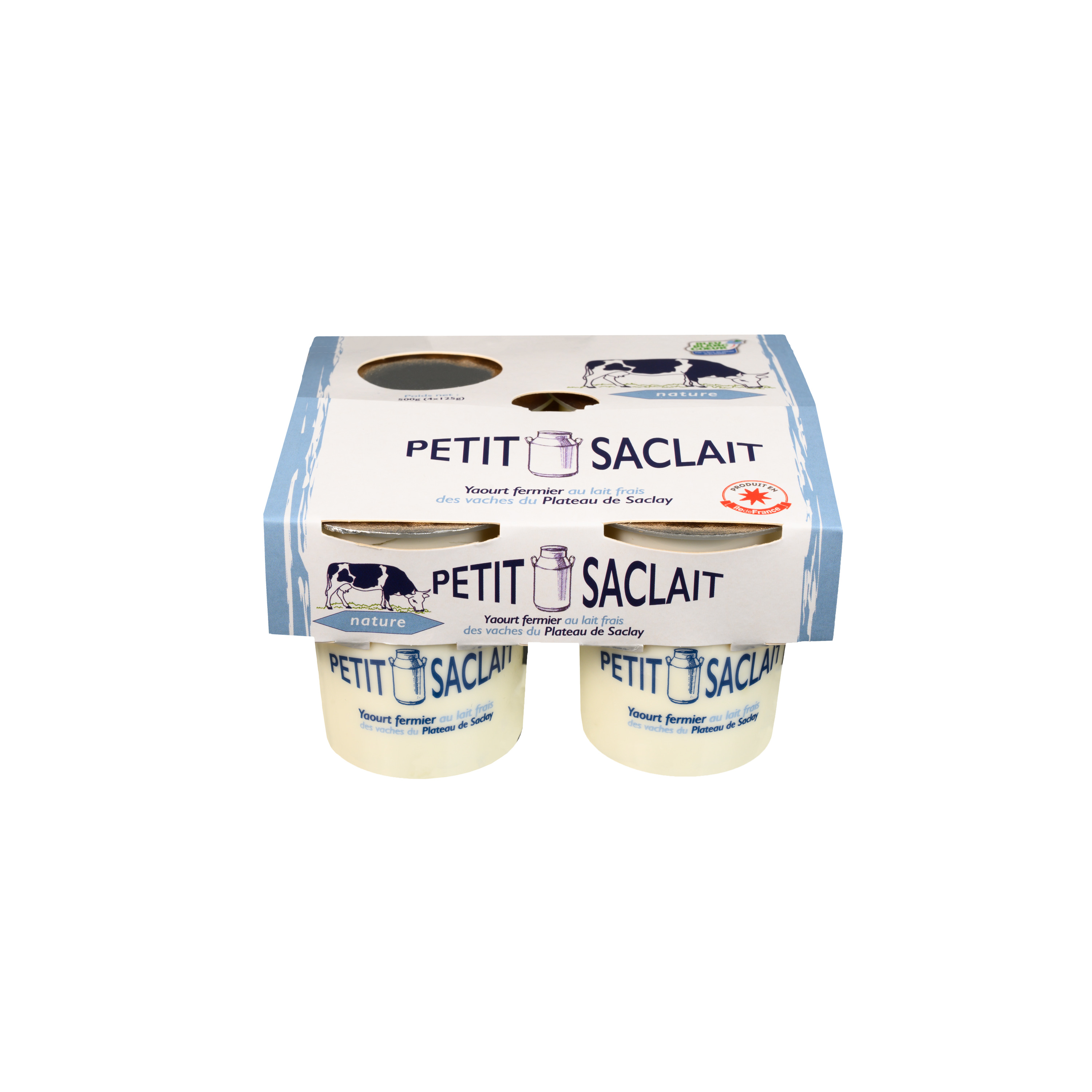 Yaourt brassé nature au lait de vaches du Plateau de Saclay. Nos yaourts bénéficient du logo Bleu-Blanc-Coeur; Bleu-Blanc-Coeur est une démarche qui contribue à améliorer la qualité nutritionnelle et environnementale de notre nutrition.