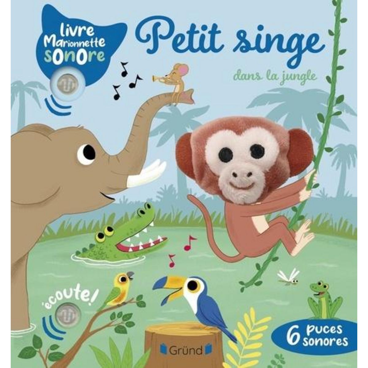 Un livre avec une marionnette de singe et 6 puces sonores ! Le grand-père de petit singe fête son anniversaire ! C'est l'occasion de former un superbe orchestre. Quels musiciens vas-tu choisir parmi les animaux de la jungle ? Danse et joue dans la jungle avec petit singe ! Fais bouger l'adorable mar