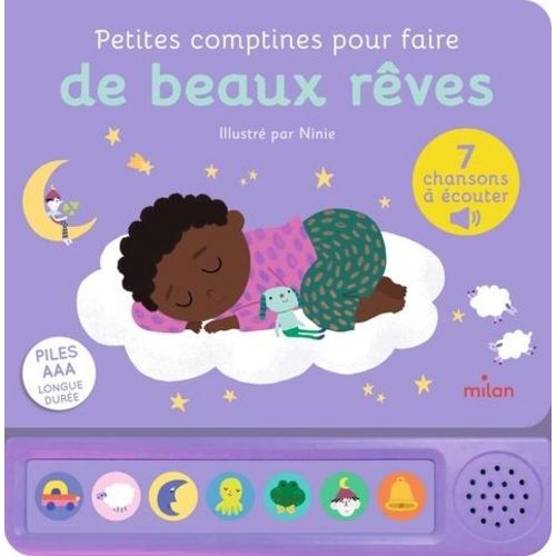 Au moment d'aller se coucher, bébé a besoin de se calmer. Ce recueil de comptines l'apaise et lui fait passer des nuits pleines de beaux rêves. Sept comptines qui font rêver Voici le livre sonore qui accompagnera bébé dans son rituel du coucher, grâce à 7 comptines connues : Dans ma chambre , Dors, dors, petit enfant , Bonsoir, madame la Lune , Berceuse de Brahms , Le Bal des crapauds , Jean de la Lune , Frère Jacques . Un livre sonore à la fabrication parfaite pour les plus jeunes lecteurs Grâce à son boîtier sonore et aux boutons faciles à déclencher, les tout-petits peuvent écouter des comptines en toute autonomie. La lecture de l image et l écoute des chansons sont simultanées, puisque le boîtier est fixé à l ouvrage, sous les illustrations. Les comptines illustrées par Ninie sont douces et oniriques, et conduiront bébé tout droit au pays des rêves.