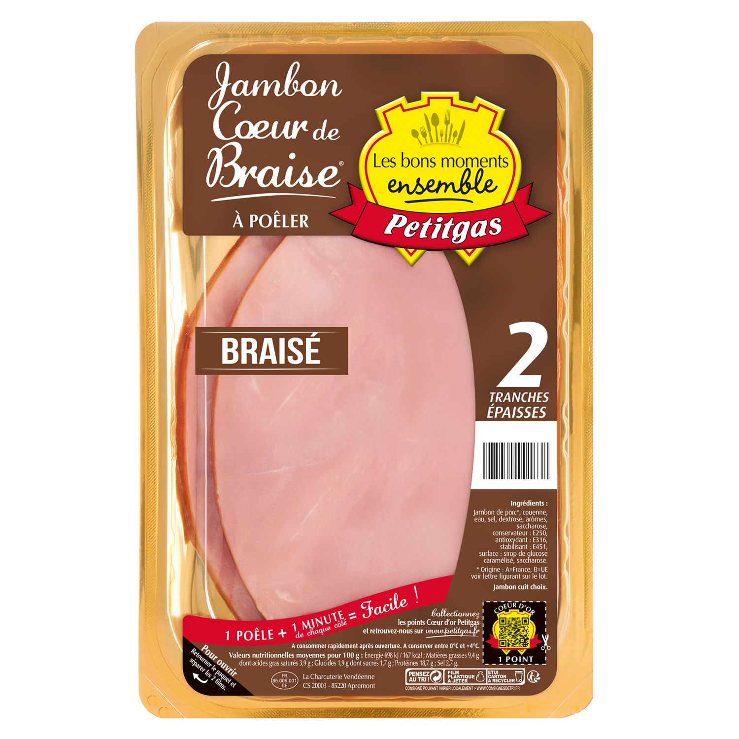 Ingrédients : Jambon de porc, couenne, eau, sel, dextrose, arômes naturels, saccharose, conservateur : E250, antioxydant : E316, stabilisant : E451. Surface : sirop de glucose caramélisé, saccharose.