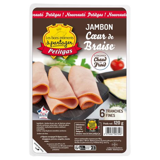 Ingrédients : Jambon de porc, eau, sel, dextrose, arômes naturels, saccharose, conservateur : nitrite de sodium, antioxydant : érythorbate de sodium, stabilisant : triphosphate. Surface : sirop de glucose caramélisé, saccharose.