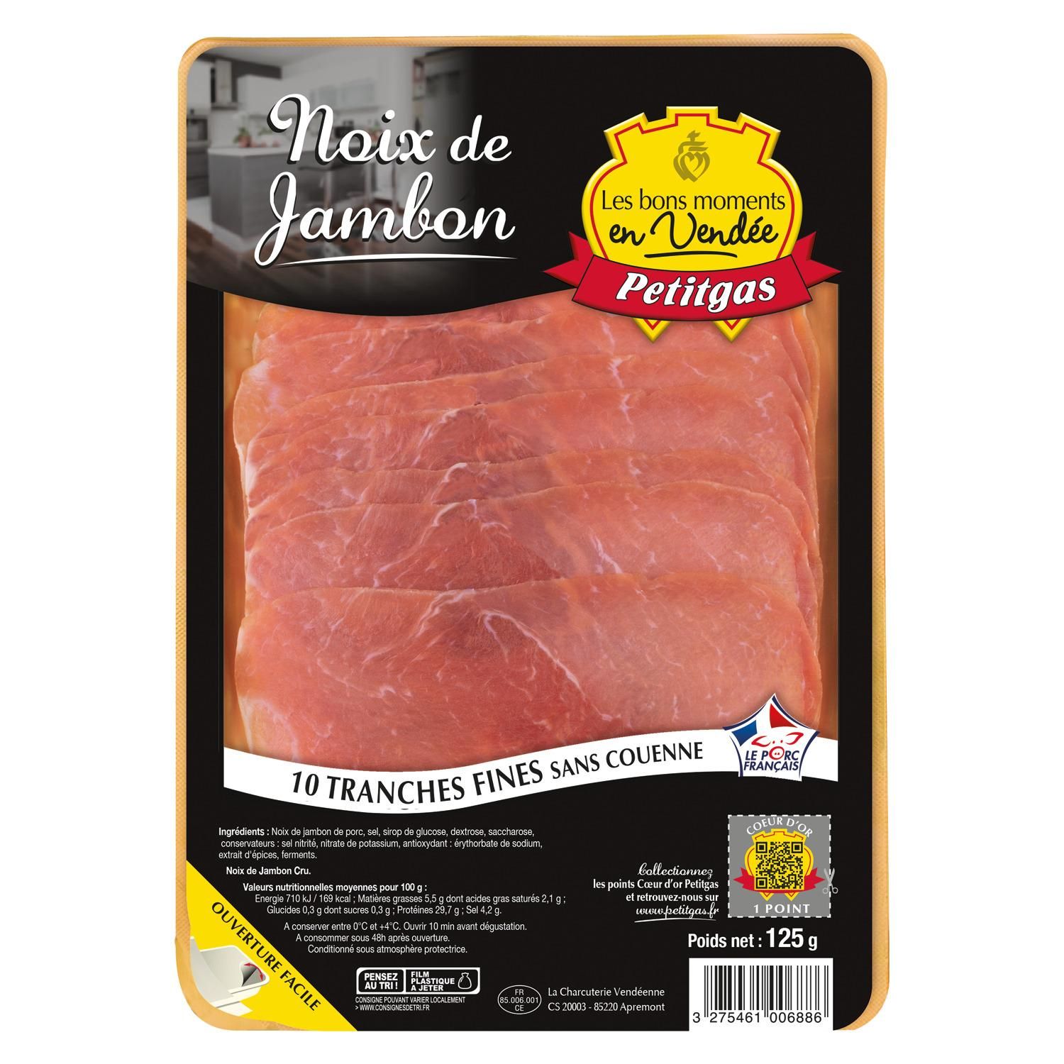 Ingrédients : Noix de jambon de porc, sel, sirop de glucose, dextrose, saccharose, conservateurs: nitrite de sodium, nitrate de potassium, antioxydant : érythorbate de sodium, extrait d'épices, ferments.