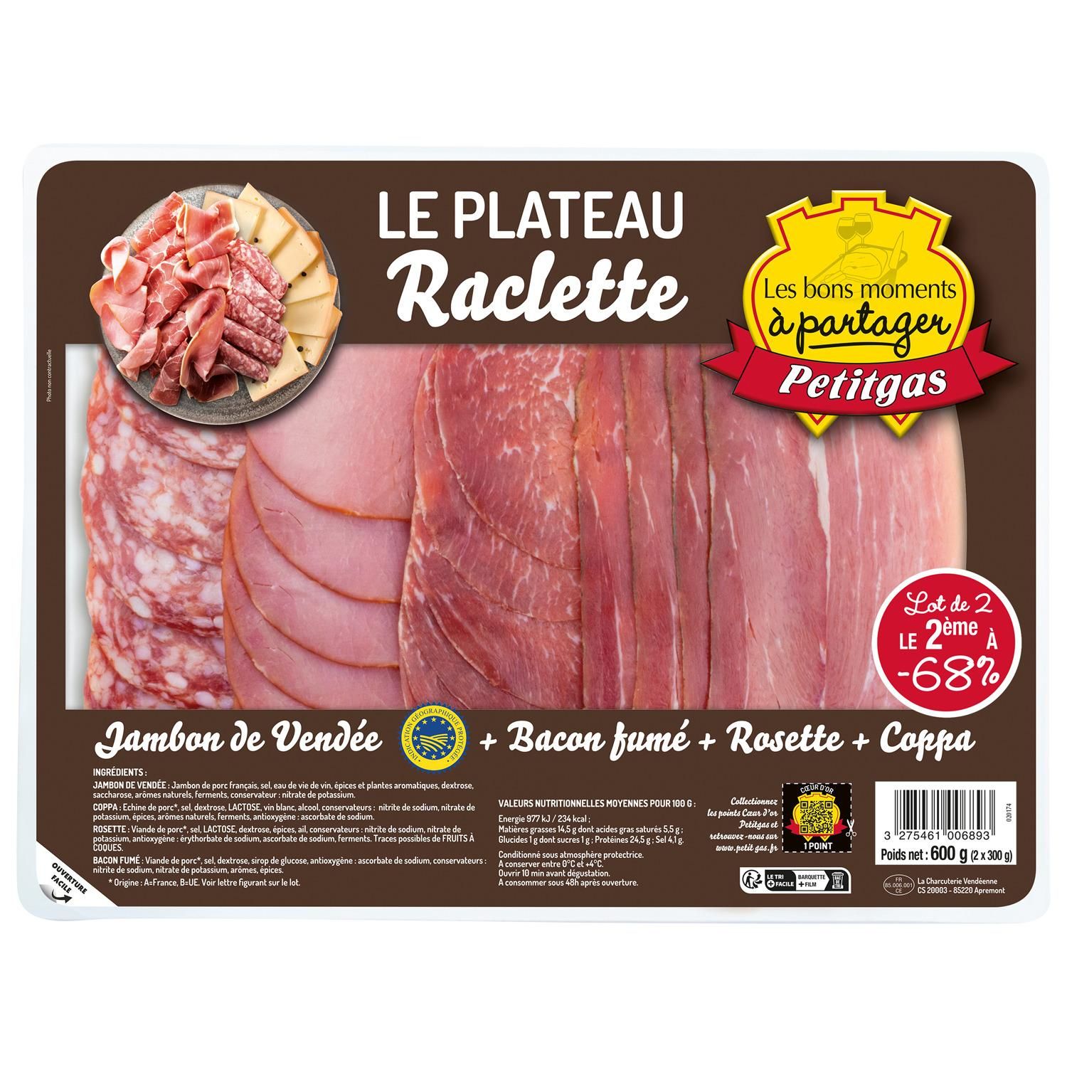 Ingrédients : Jambon de Vendée : Jambon de porc français, sel, eau de vie de vin, épices et plantes aromatiques, dextrose, saccharose, arômes naturels, ferments, conservateur: nitrate de potassium