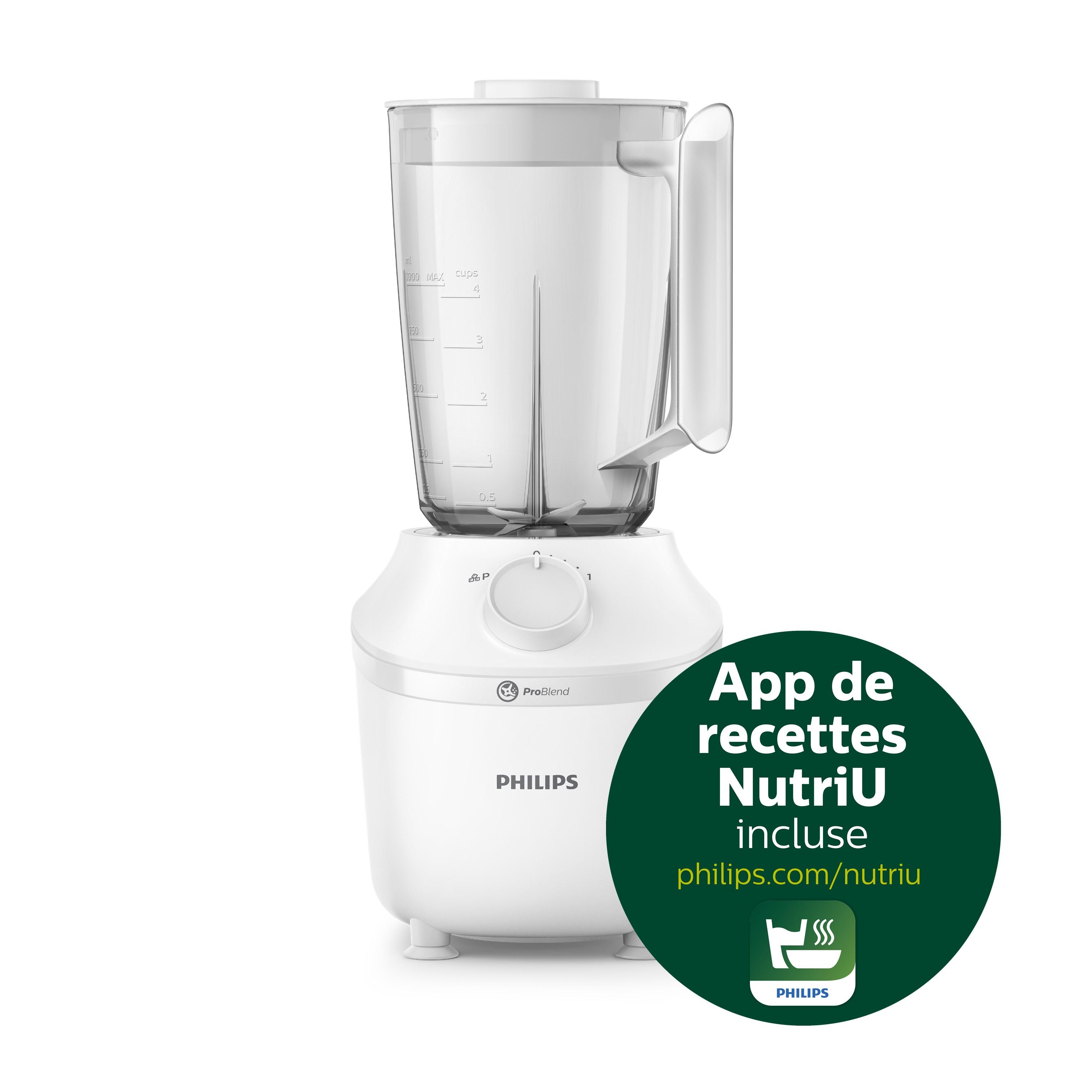 [Cet avis a été recueilli en réponse à une offre.] Dés réception du produit, j’ai trouvé le Blender beau et compact. Il est facile à ranger dans un placard. J’ai été surprise par la qualité du bol en verre. La gourde permet de réaliser des smoothies et ils sont facilement transportables dans celle-ci. J’ai commencé par tester le produit en réalisant un houmous. Il est très simple d’utilisation avec le bouton qui permet de choisir différents niveaux de mixage. Mon houmous a été très simple et rapide à réaliser. Le moment du nettoyage venu, j’ai juste eu à dévisser et à mettre les différents éléments au lave-vaisselle. J’ai également testé une recette de beurre de cacahuètes, je suis ravie car on peut choisir sa texture, plus ou moins crunchy. J’ai téléchargé l’application nutriU, ce qui me permet d’avoir accès à de nombreuses recettes, notamment de smoothies. Elle est très simple d’utilisation et permet de varier les recettes. J’ai reçu ce produit dans le cadre d’un test de produit, Philips n’a eu aucune influence éditoriale sur l’évaluation.