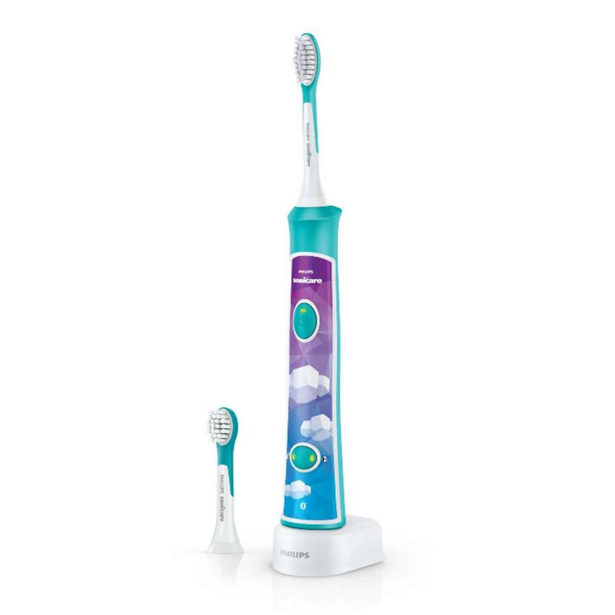 Accessoires inclus : 1 manche Philips Sonicare For Kids Connectée, 1 tête de brosse Philips Sonicare For Kids standard, 1 tête de brosse Philips Sonicare For Kids compacte, 1 chargeur, 8 autocollants pour personnaliser sa brosse à dents, 2 autocollants offerts.