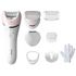 Un kit accessoires est inclus : un gant exfoliant permettant de prévenir l'apparition de poils incarnés entre deux épilations, une housse de protection pour tout ranger au même endroit, une tête de rasage, sabot de coupe, tête tondeuse bikini, peigne, des accessoires zones délicates et contact optimal, brossette.