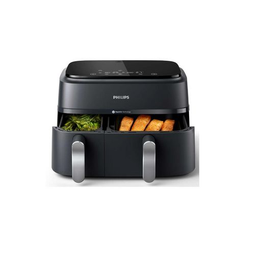 Plus besoin de vérifier des informations ou de les deviner. Grâce à l'écran tactile, l'Airfryer à double panier propose des températures et des durées prédéfinies pour les frites fraîches, les frites surgelées, le poulet, la viande, les légumes, poisson, les gâteaux, et le réchauffage.Faible consommation d'énergie :