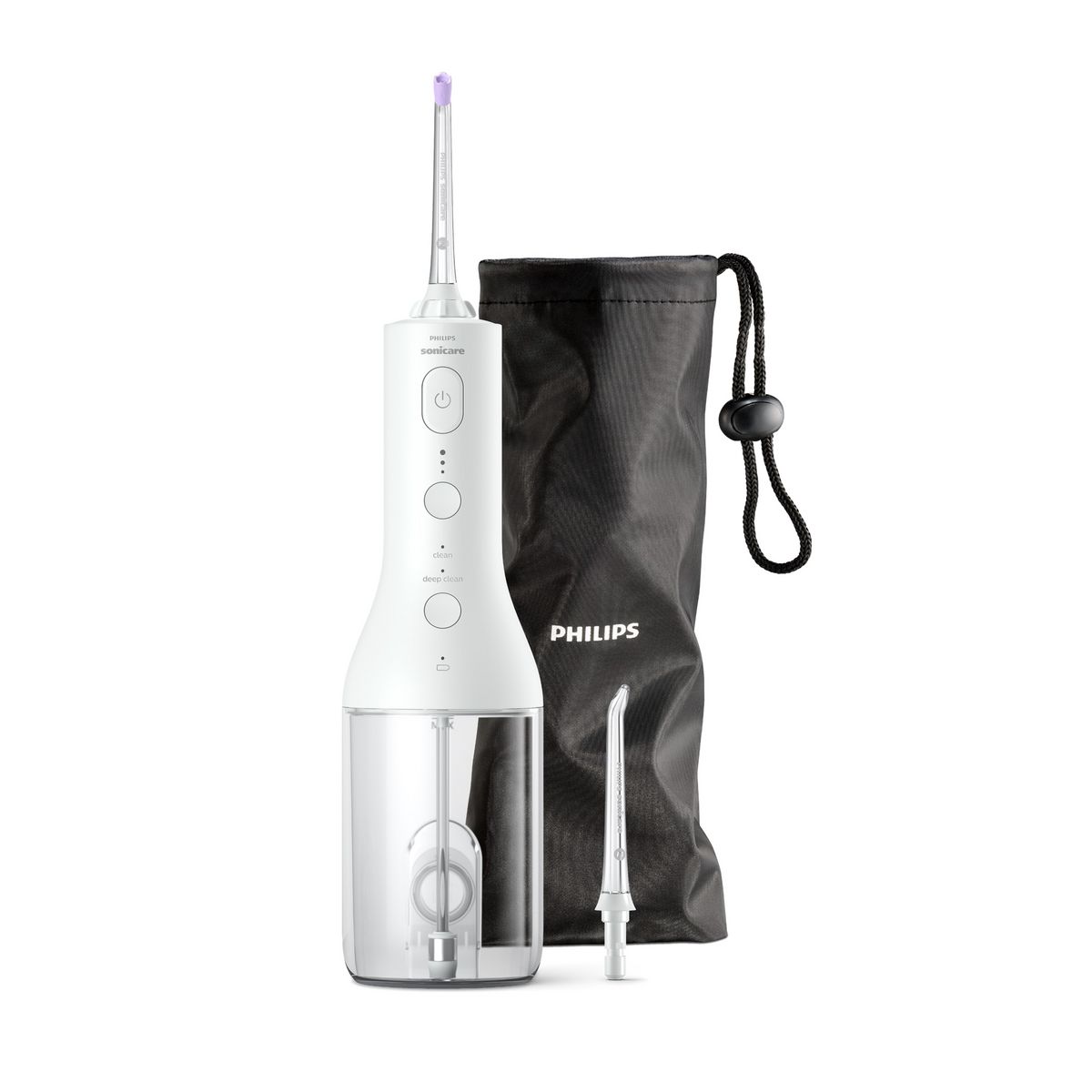 1 Jet dentaire Power Flosser sans fil Blanc, 2 canules (1 Quad Stream F3 & 1 Standard F1), 1 étui de transport pour canules, 1 Chargeur USB-C
