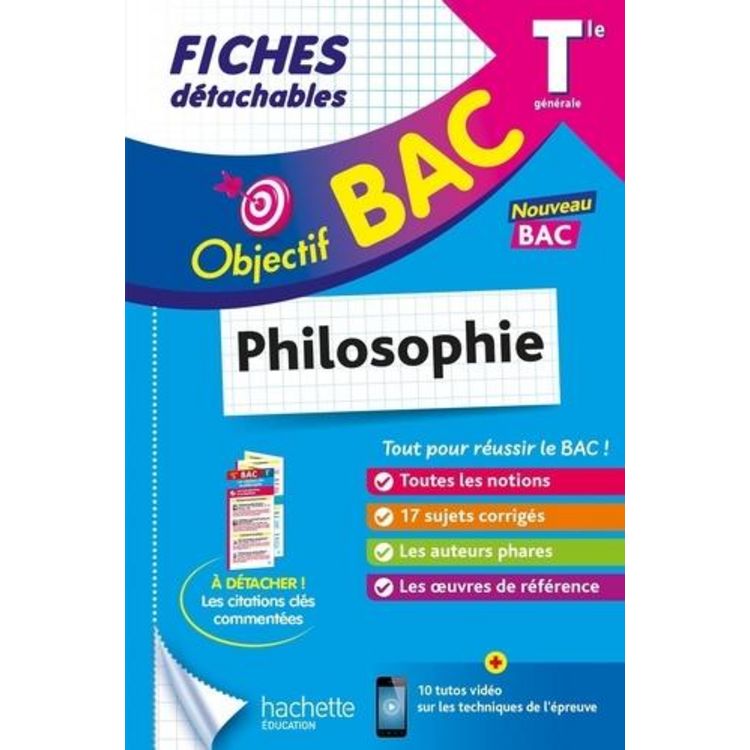 Tout pour réussir le Bac ! - Tout le programme en 59 fiches détachables - Une fiche de cours par notion du programme, pour mémoriser l'essentiel - Une dissertation ou une explication de texte corrigée par notion - Le descriptif de l'épreuve et tous les conseils pour réussir - 10 tutos vidéo à télécharger gratuitement sur www.parascolaire.hachette-education.com.