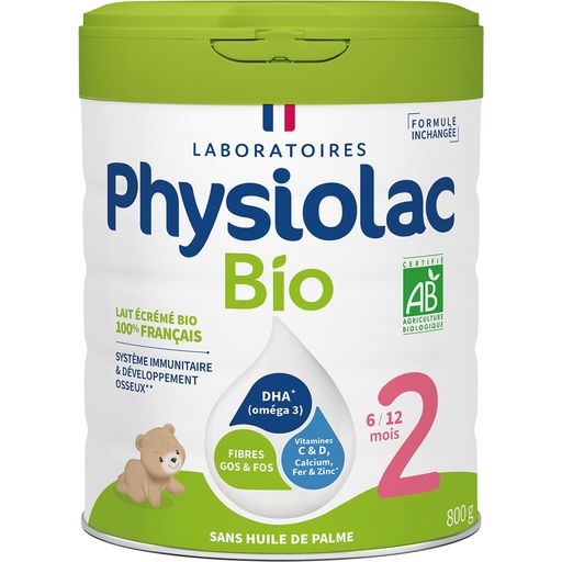 Lait de suite biologique en poudre pour nourrissons de 6 à 12 mois. Les Laboratoires Physiolac proposent des laits : spécialement développés et validés par des experts en nutrition infantile, répondant aux besoins nutritionnels spécifiques des bébés*, avec un lait écrémé 100% français, fabriqués en France. Physiolac Bio 2, formulé sans huile de palme et certifié agriculture biologique, contient notamment : du DHA* (oméga 3), de la crème de lait Bio, des fibres Bio GOS et FOS, du bisglycinate de fer assimilable, du fer, du zinc et de la vitamine C pour contribuer au maintien du bon fonctionnement du système immunitaire, de la vitamine D et du calcium pour le maintien d'un bon développement osseux. Le lait Physiolac Bio est fabriqué en Vendée par la Laiterie de Montaigu, avec du lait écrémé 100% français. Le lait Bio utilisé dans nos formules est collecté auprès des éleveurs Biolait, engagés en faveur du bien-être animal conformément aux règles de l'agriculture biologique. *Comme l'exige la législation pour toutes les préparations de suite. Avis important : Le lait maternel est le meilleur aliment pour le nourrisson. En accord avec votre pharmacien ou votre médecin, Physiolac Bio 2 peut s'y substituer ou le compléter si vous ne pouvez pas ou ne souhaitez pas allaiter. Physiolac Bio 2 répond aux besoins nutritionnels spécifiques du nourrisson à partir de 6 mois. Ne changez pas ce lait de suite sans l'avis de votre pharmacien ou de votre médecin. Ce produit est un élément d'une alimentation diversifiée des nourrissons à partir de 6 mois et ne peut remplacer le lait maternel pendant les 6 premiers mois de la vie. La décision d'introduire des aliments complémentaires doit être prise sur l'avis des professionnels de santé.