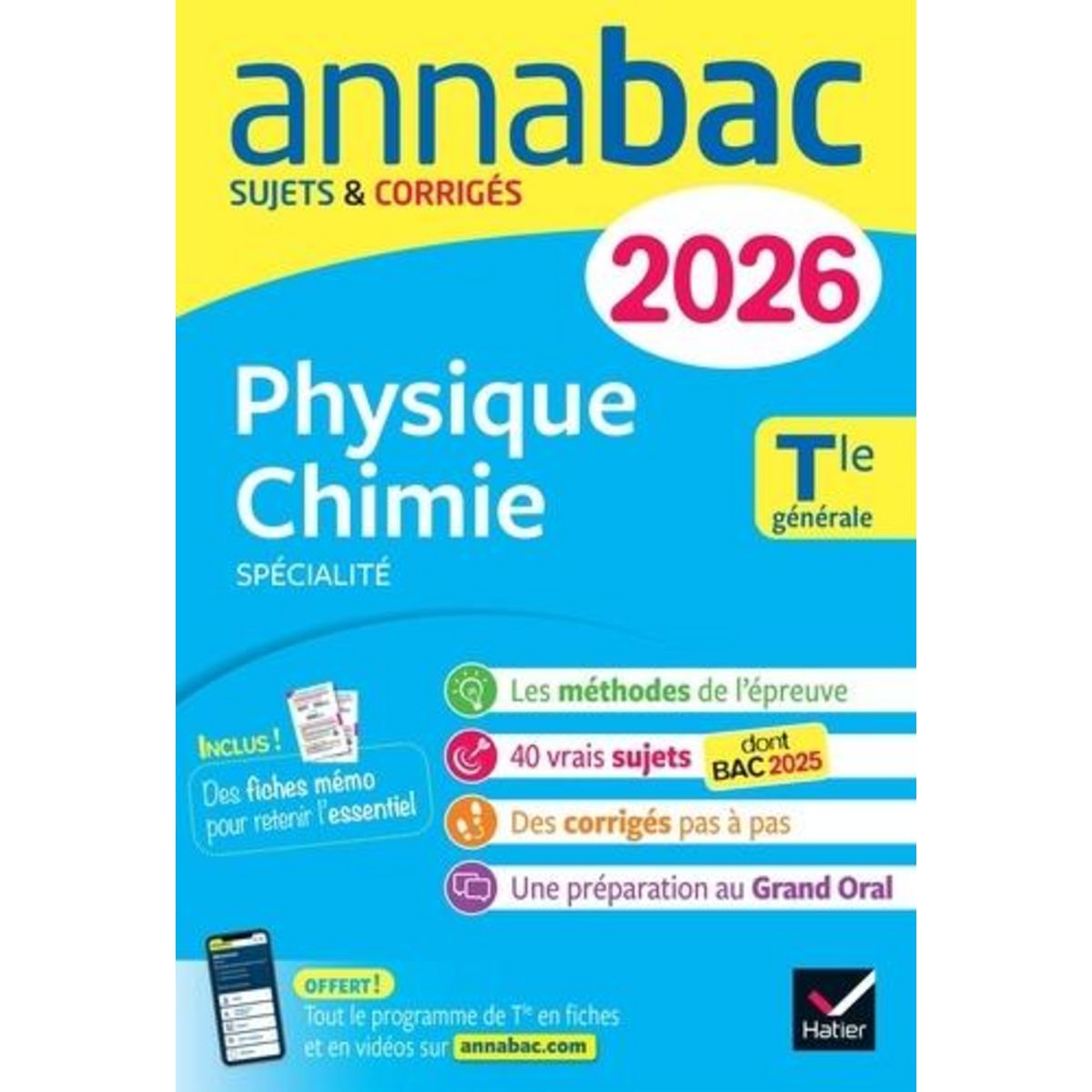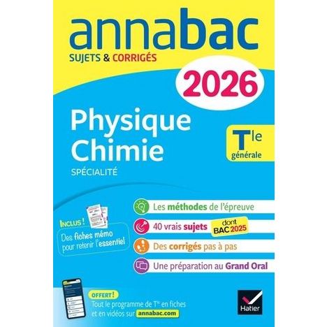 Pour réussir l'épreuve de Physique-chimie du bac 2026 ! - des sujets corrigés - des conseils de méthode - des fiches mémo couvrant tout le programme - une préparation complète à l'ECE - un accompagnement efficace vers le Grand Oral - des vidéos Le succès assuré en 5 étapes ! 1. Comprendre l'épreuve, s'approprier les méthodes Des conseils de méthode et des sujets traités pas à pas pour comprendre comment analyser un énoncé d'exercice de bac et comment traiter les questions. 2. S'entraîner sur chaque notion du programme Des fiches mémo pour réviser l'essentiel et 26 sujets guidés, qui couvrent l'ensemble du programme de spécialité en Physique-chimie. 3. Préparer l'écrit dans la dernière ligne droite L'épreuve écrite approche : c'est le moment de réviser à l'aide des vidéos et des sujets complets de la session 2025, pour se mettre dans les conditions de l'examen. 4. Réussir l'évaluation des compétences expérimentales (ECE) Des fiches de méthode et un sujet d'ECE pour comprendre les exigences de cette partie de l'épreuve. 5. Réussir le Grand Oral Dans une dernière section, des fiches de méthode et des simulations d'oral sur des questions issues du programme de Physique-chimie. En plus, avec l'achat de l'ouvrage, un abonnement gratuit au site de révision http : //www. annabac. com (Lien -> http : //www. annabac. com/) : fiches et vidéos de cours, quiz, sujets corrigés...