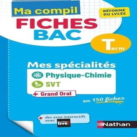 Une compil' de fiches par duos de spécialités, Physique-Chimie et SVT, pour réviser vite et bien ! + des fiches consacrées au Grand oral du Bac Conforme à la réforme du Lycée Physique-Chimie et Sciences de la vie et de la Terre + Grand oral Terminale Des fiches simples et claires pour un maximum d'efficacité : - 150 fiches détachables au format poche pour réviser un peu tout le temps. - Des synthèses sur toutes les notions des nouveaux programmes de vos spécialités. - Les méthodes utiles pour réussir les épreuves finales et le Grand oral. - Avec des quiz pour s'auto-évaluer. Et en plus : - Un système pratique pour suivre ses révisions : lue , relue , apprise - Des infos-clés sur les rabats de couverture. - Des exos interactifs avec l'application Nathan Live !