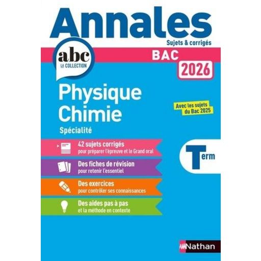 Les Annales ABC du BAC pour réviser et préparer l'épreuve de Physique-Chimie Terminale du Bac 2026. - 42 sujets corrigés pour préparer l'épreuve et le Grand oral. - Des fiches de révisions pour retenir l'essentiel. - Des exercices pour contrôler ses connaissances. - Des aides pas à pas et la méthode en contexte Annales ABC du BAC 2026 Physique-Chimie Terminale - Enseignement de spécialité Conforme aux programmes du Bac Une nouvelle formule pour préparer avec succès l'épreuve finale du nouveau Bac ! Les épreuves du nouveau Bac expliquées. Les bonnes méthodes à acquérir pour réussir. Des rappels de cours, des QCM et des exercices pour faire le point. Des sujets pas à pas avec des corrigés expliqués. Des sujets de Bac comme à l'examen pour s'exercer. Un cahier spécial Grand oral.