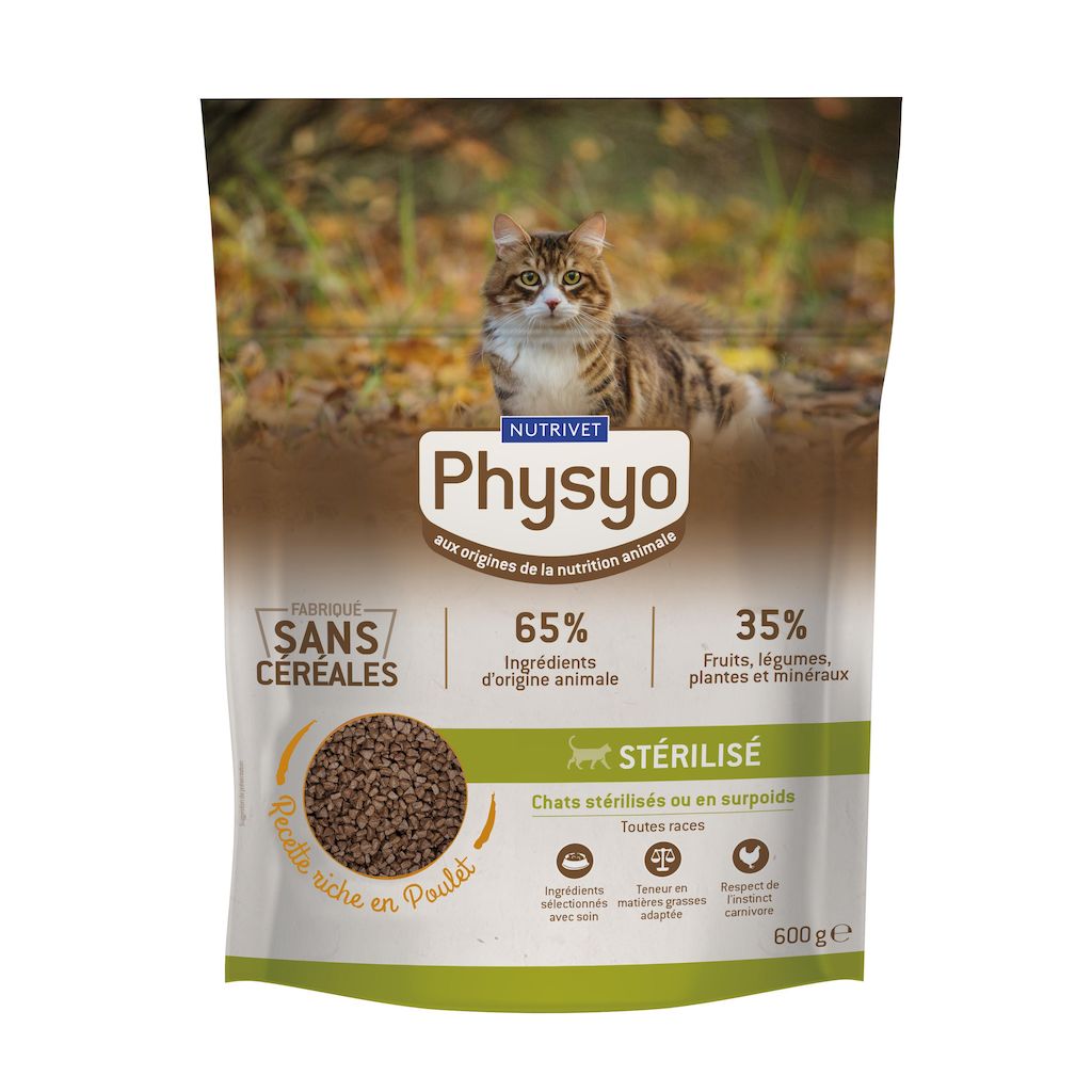 NOUVEAU FORMAT et NOUVELLE RECETTE! Nos croquettes pour chat stérilisé ou en surpoids (de plus de 12 mois) sont fabriquées sans céréales. La viande est le 1er ingrédient de notre recette pour respecter l’instinct carnivore des chats. Notre recette est garantie sans additifs artificiels ni colorants artificiels. Elle apporte à votre chat stérilisé tout ce dont il a besoin au quotidien. Il va en raffoler !
