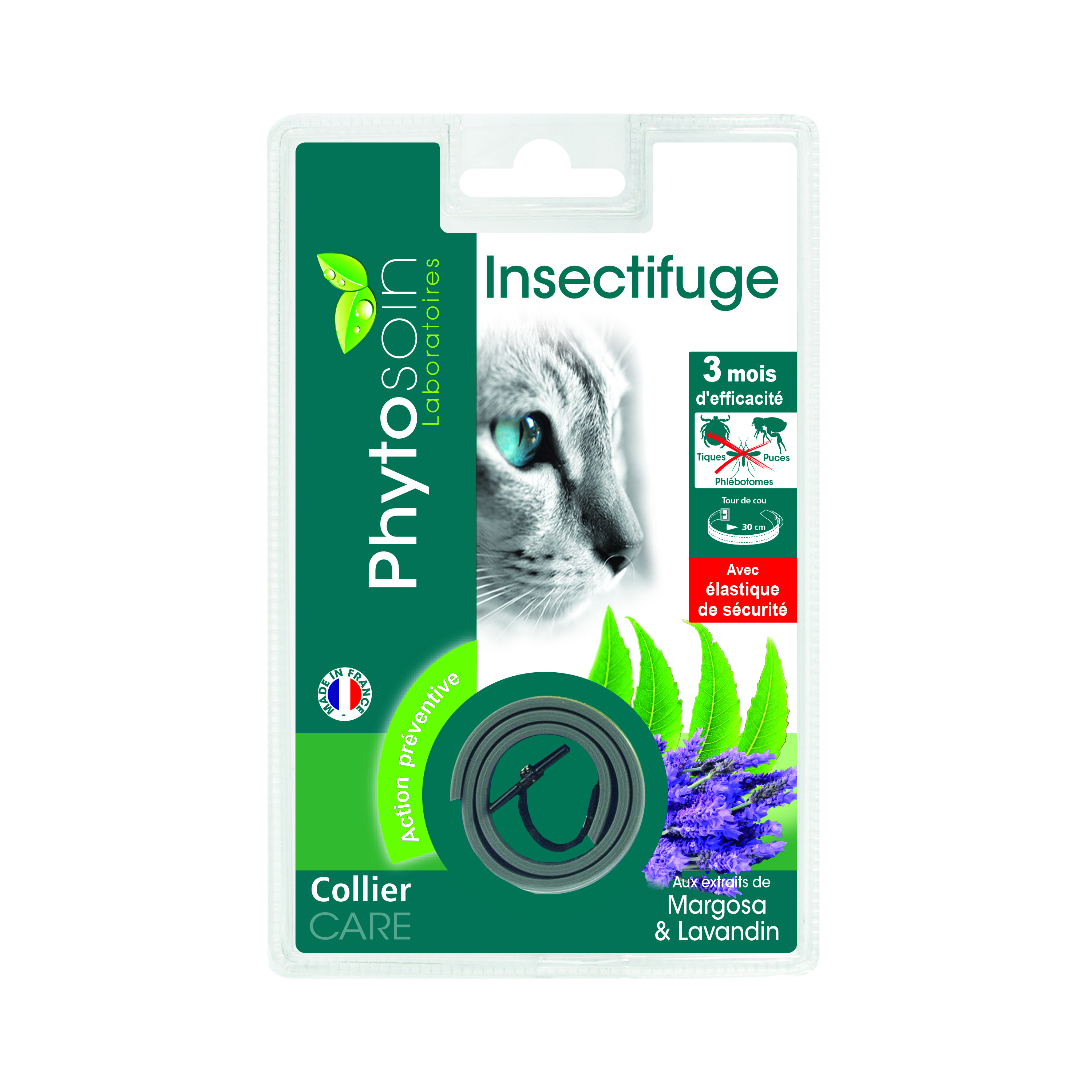 Les insectes nuisibles et autres parasites du chat sont très sensibles à certaines odeurs qui les repoussent. Le collier insectifuge chat Phytosoin a été spécialement conçu pour un usage préventif. La combinaison d’actifs végétaux issus du Margosa et de l’huile essentielle de lavandin, tous deux reconnus pour leur effet répulsif, protégera votre compagnon des désagréments liés à ces nuisibles. Grâce à son procédé de fabrication, ce collier diffusera ses actifs de façon continue pendant 3 mois, sans gêner l’odorat de votre chat. Il est également muni d’un élastique de sécurité permettant au chat de se libérer du collier si celui-ci s’accroche à quelque chose. Son action optimale nécessite quelques jours et il ne craint ni l’eau, ni l’humidité.