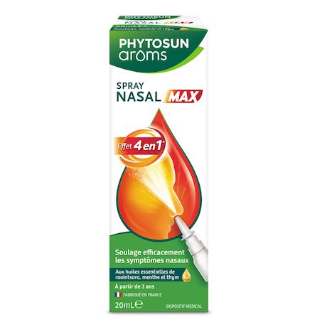 Phytosun Arôms SPRAY NASAL MAX est un dispositif médical qui réduit les symptômes du rhume* en soulageant les principaux problèmes nasaux grâce à son effet 4en1*: - Nez bouché - Nez qui coule - Eternuement - Congestion faciale * Chez l'adulte - Eccles study, Rhino Study"
