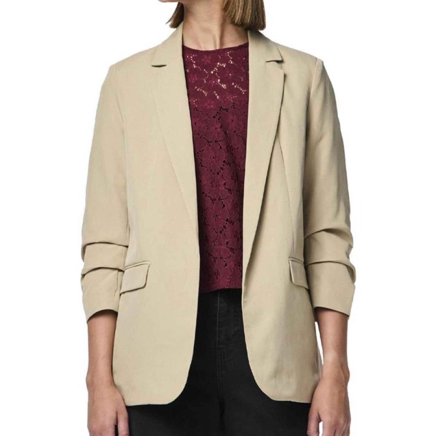 Craquez pour le blazer femme Pieces !Manches 3/4Sans fermetureColoris : Beige Poches passepoiléesComposition : 90% polyester , 10% élasthanne