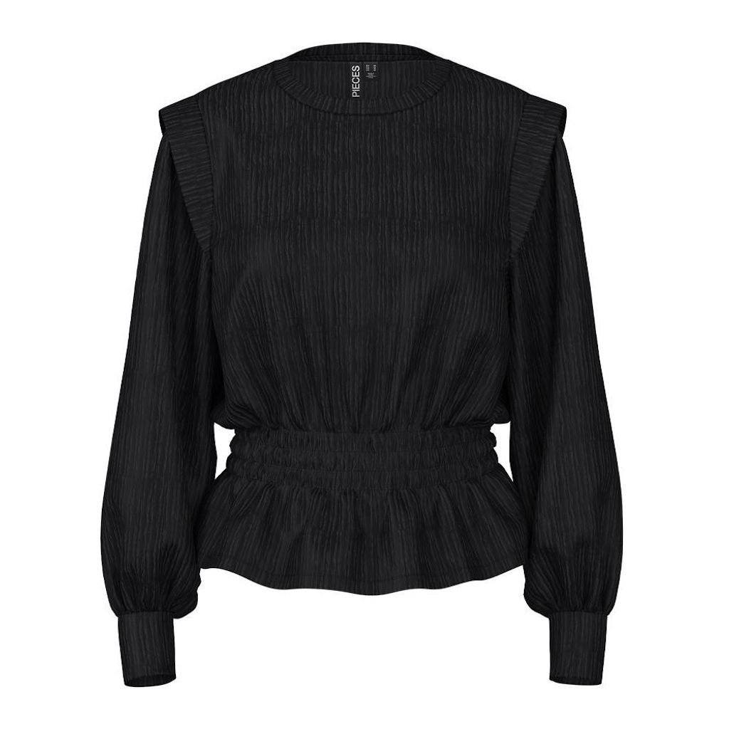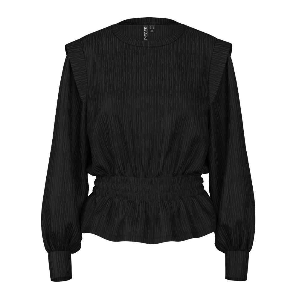 Craquez pour la blouse de la marque Pieces !Coloris : Noir Col rond Manches longues Élastique à la taille Tissu texturé Composition : 96% Polyester, 4% Élasthanne