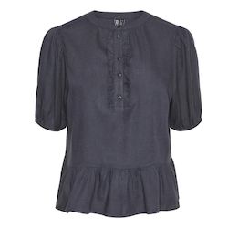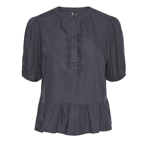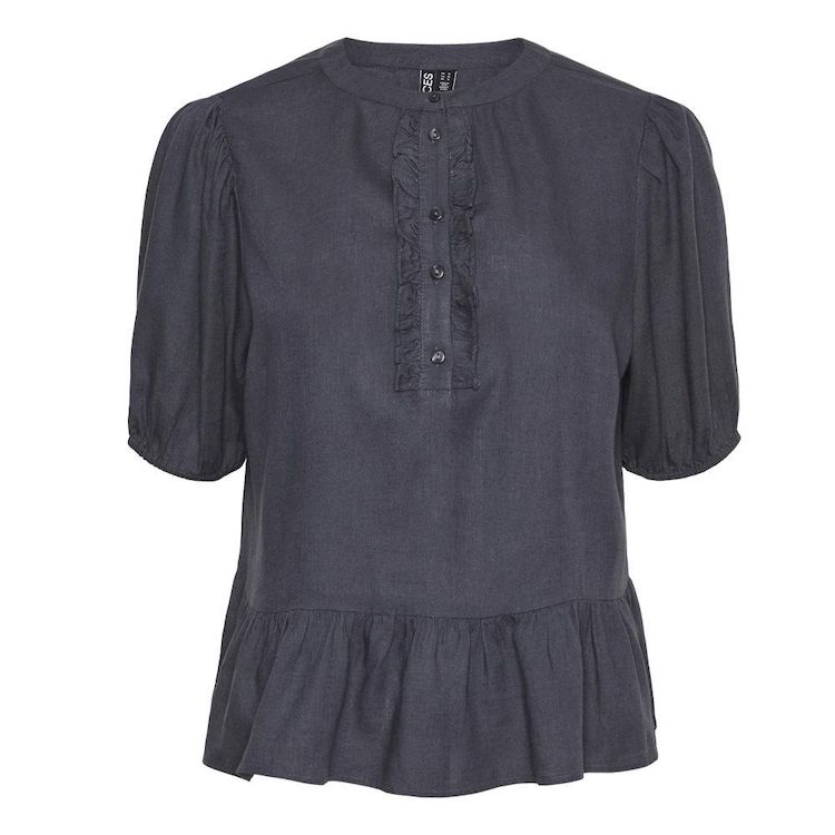 Craquez pour la blouse noir de la marque Pieces !Coloris , Marine Col rondManches courtesFermeture boutonsVolant en basComposition : 70% Viscose, 30%Lin