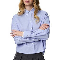 Optez pour cette chemise Pieces à prix bas !Coloris : BleuCol chemiseManches longuesComposition : 63% Polyester recyclé, 37% CotonMotifs imprimés