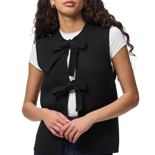 Optez pour ce gilet Pieces à prix bas !Coloris :NoirCol rondSans manchesComposition : 90% polyester, 5% élasthanne, 5% laineFermeture : LaçageRéversibleNœud décoratif