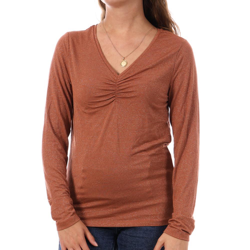 Optez pour le t-shirt femme de la marque Pieces !Manches longuesCol VRayuresColoris : Marron Composition : 85% viscose , 10% fibres métalliques , 5% élasthanne