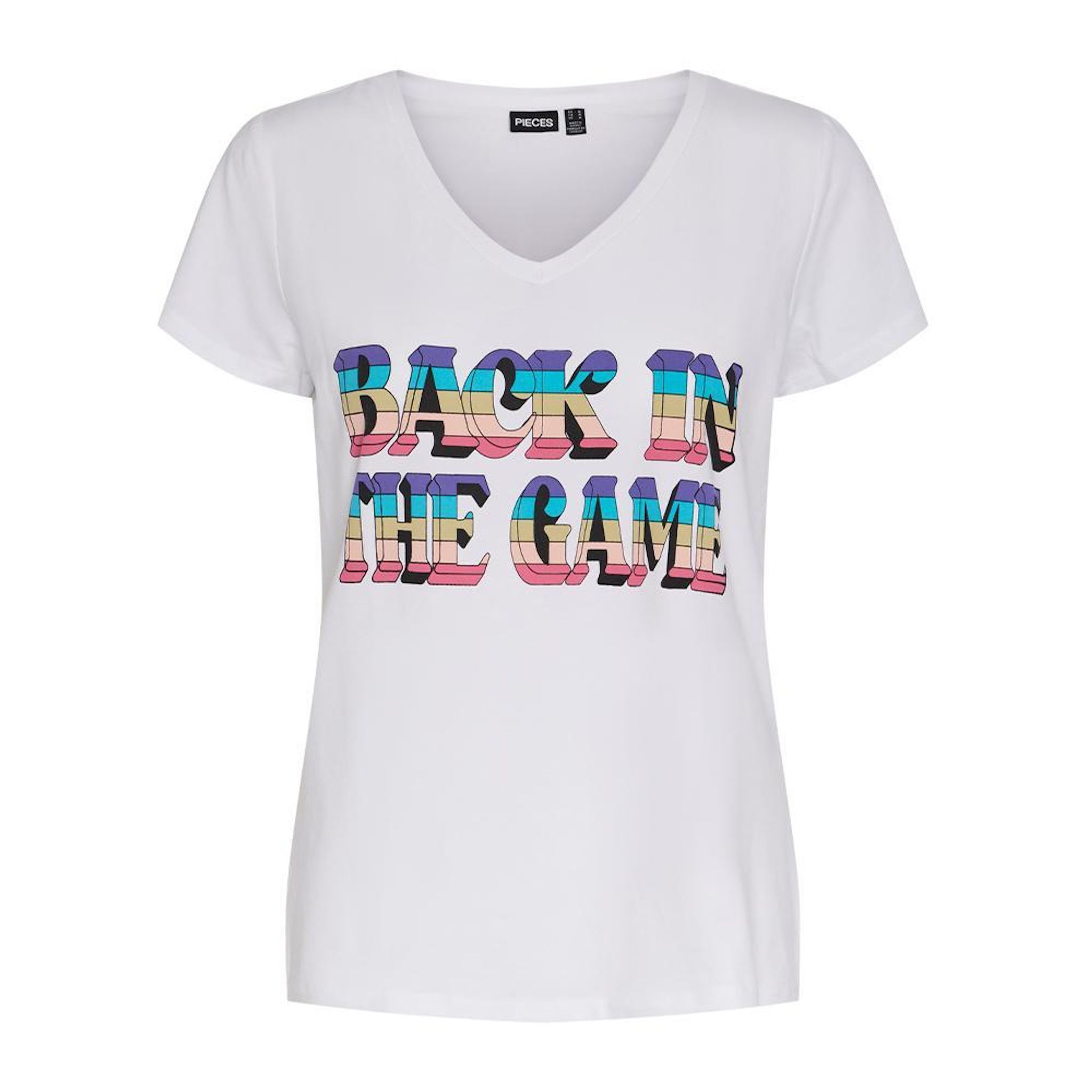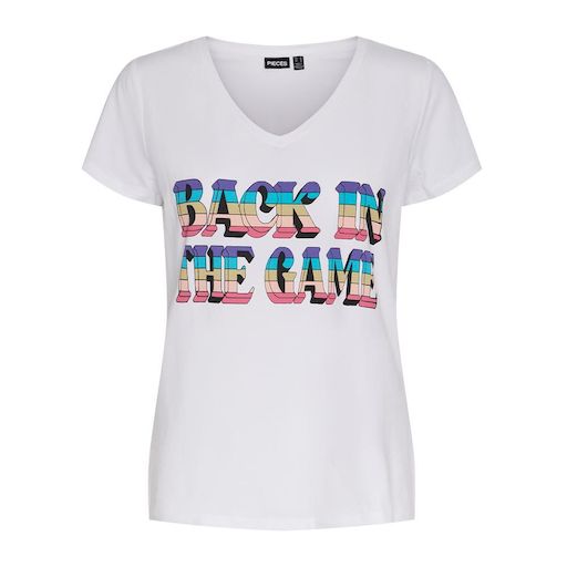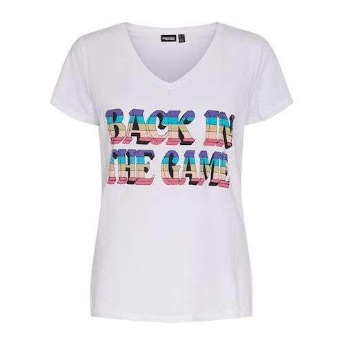 T-shirt femme de la marque Pieces !Manches courtesCol VColoris : BlancLogo brodéComposition : 95% coton , 5% élasthanne