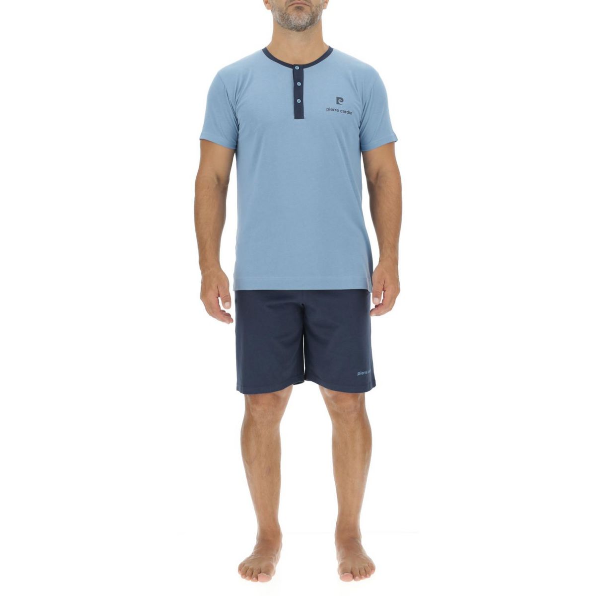 Découvrez notre magnifique pyjama homme bleu et bleu marine 100% coton pierre cardin underwear, conçu pour vous offrir un confort optimal, léger cet ensemble vêtement de nuit short et t-shirt est parfait pour les nuits d'été. Ce pyjama est composé d'un tee shirt homme à manches courtes avec un col b