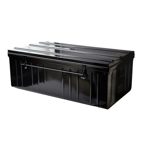 Cette malle de rangement standard 100 cm PIERRE HENRY d'une capacité de 175 litres est fabriquée en acier XC recyclable d'épaisseur 5/10 ème et est équipée de poignées latérales. Coloris Noir satiné. Fabrication française.