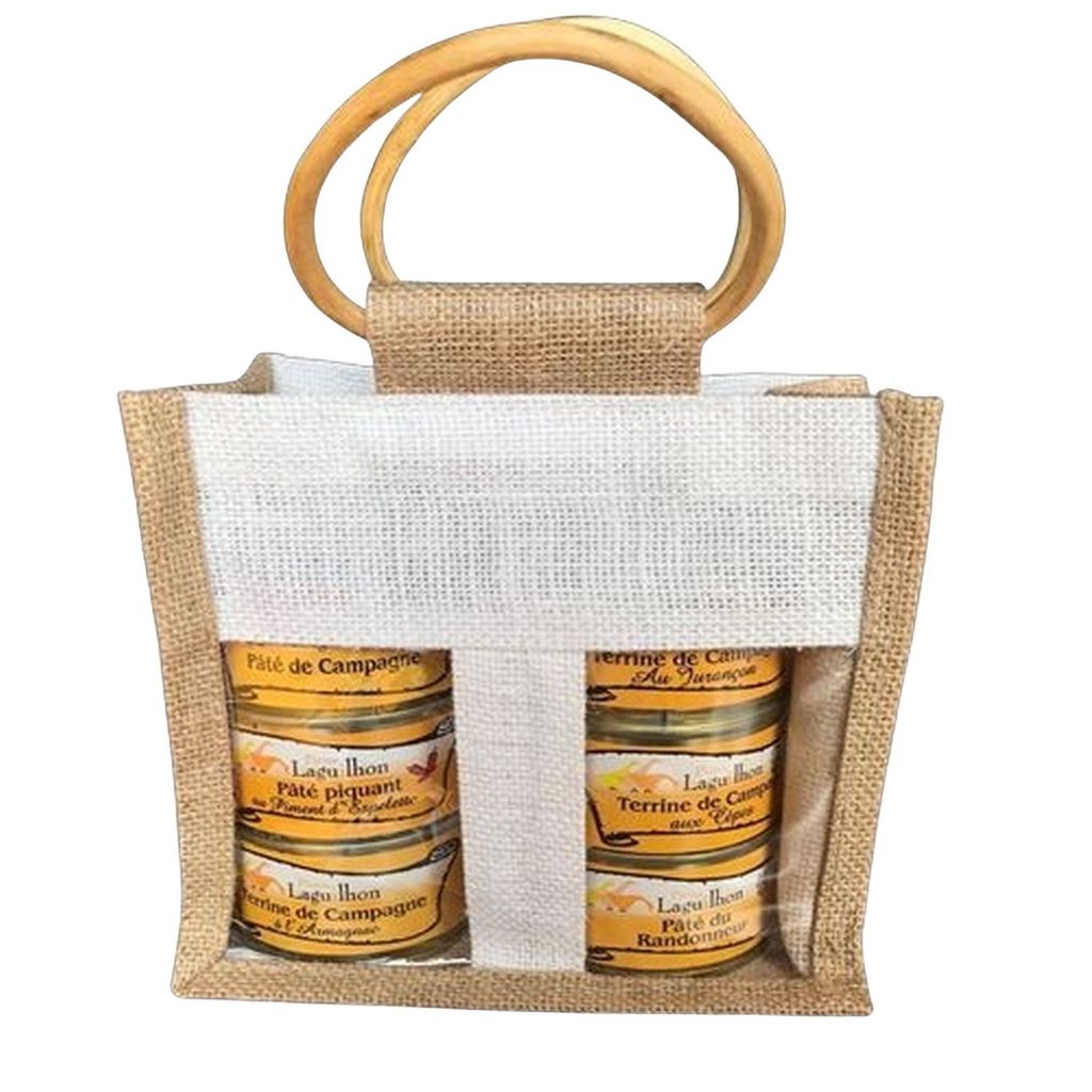Assortiment de pâtés : - 1 boîte Terrine de Campagne au Jurançon 125 g - 1 boîte Terrine de Campagne aux Cèpes 125 g - 1 boîte Terrine de Campagne à l’Armagnac 125 g - 1 boîte Pâté Piquant au Piment d’Espelette 125 g - 1 boite Pâté de Campagne 125g - 1 boîte Pâté du Randonneur 125 g
