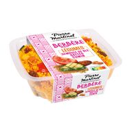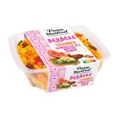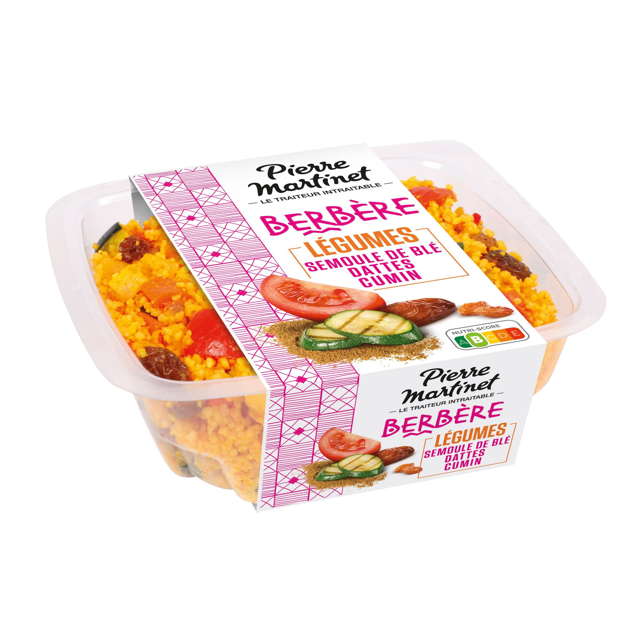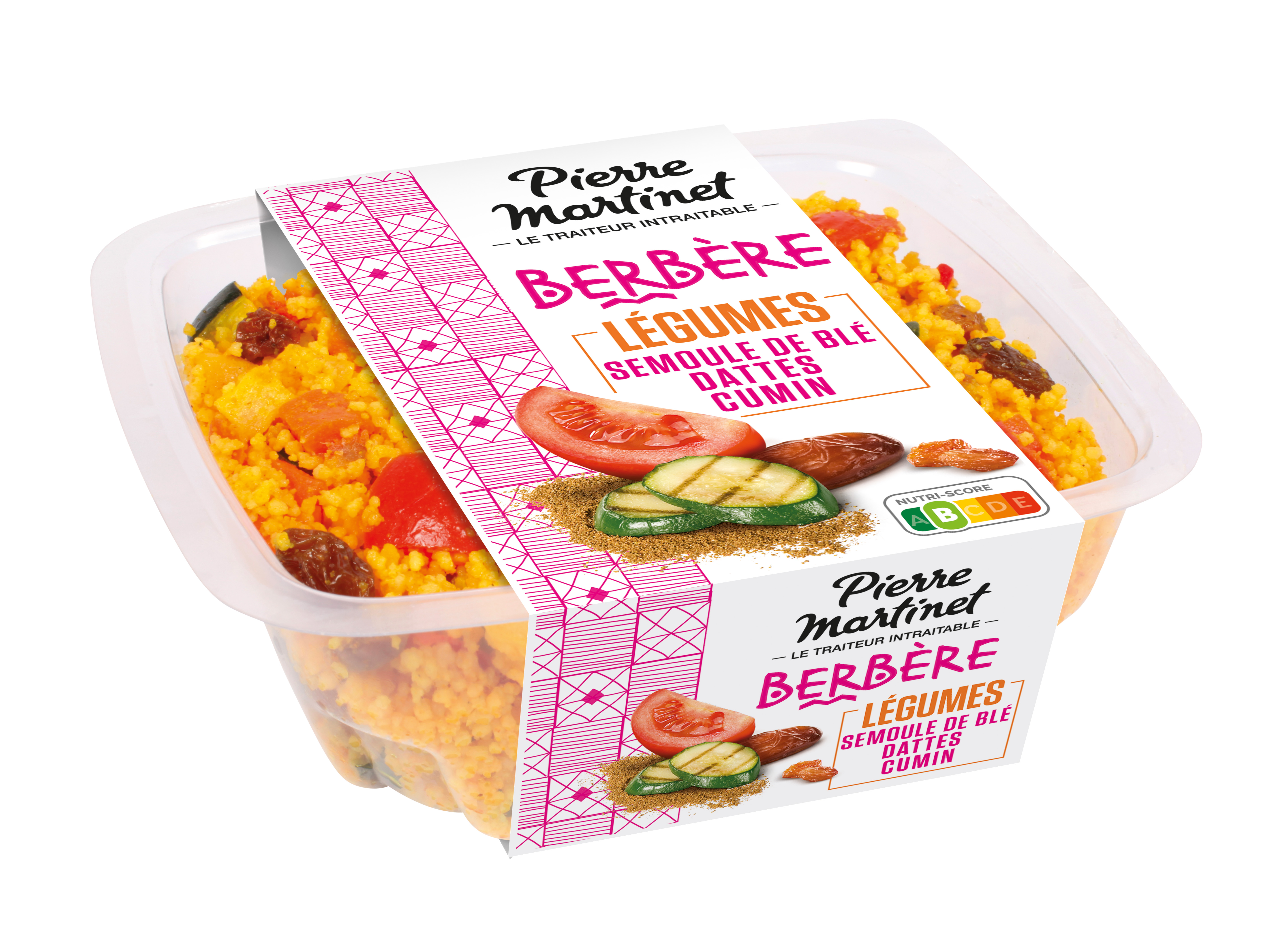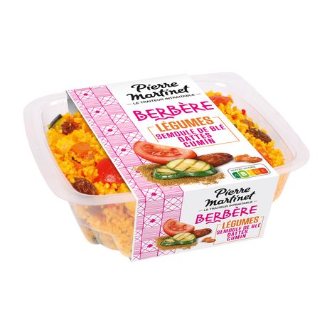 Ingrédients : Ingrédients : légumes 40% (tomates 14%, courgettes grillées 10%, carottes cuites 10%, oignons, poivrons en purée), semoule de blé dur réhydratée 39% (semoule de BLEdur, eau), huile de colza, jus de citron à base de concentré, dattes 4,2%, raisins secs 3,3%, jus d'orange concentré, cumin, épices, betterave en poudre, sel, conservateur : sorbate de potassium.