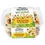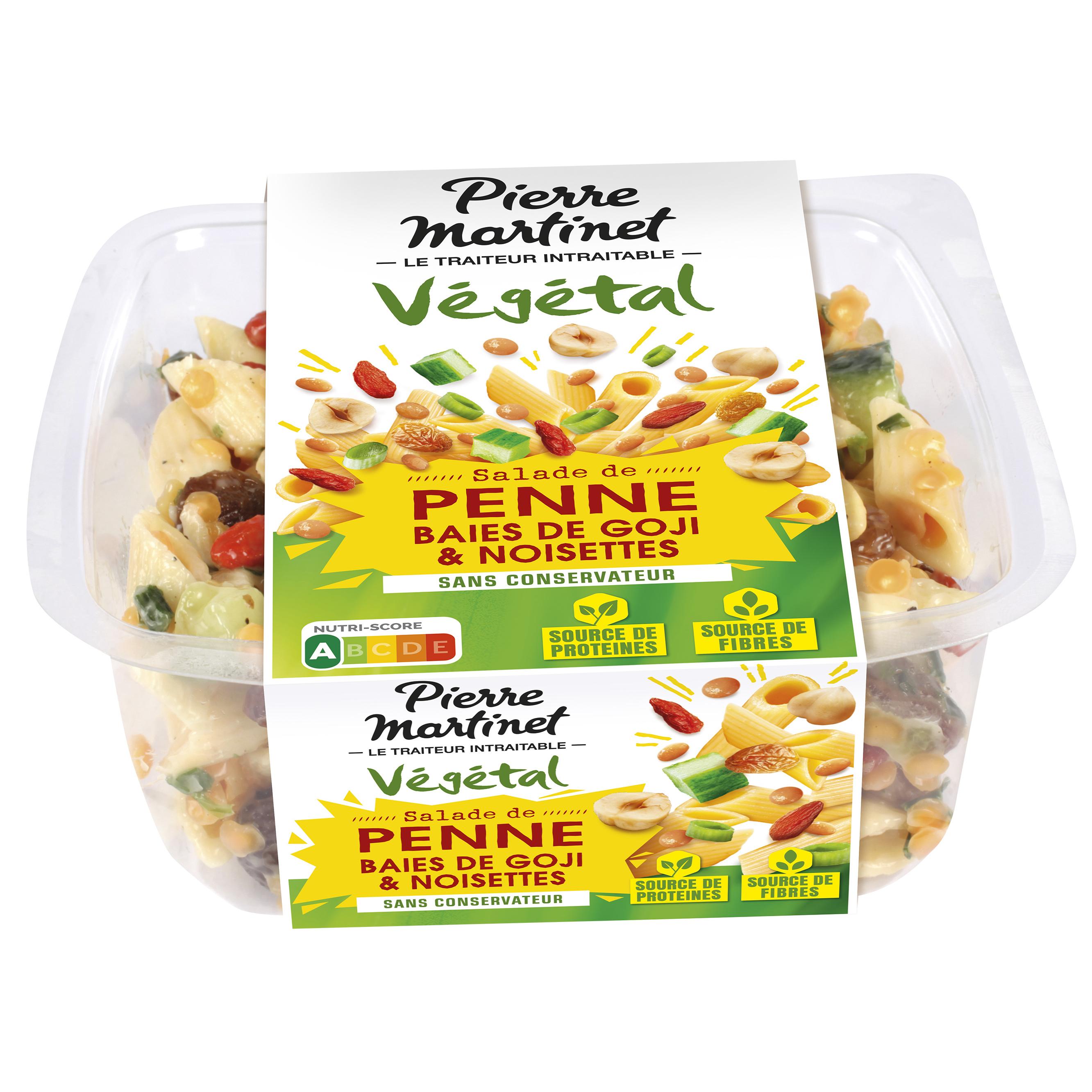Une délicieuse salade végétale à base de penne accompagnée de baies de goji & noisettes, lentilles corail, concombres, raisins secs et ciboule.