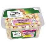 Ingrédients : Ingrédients : pâtes serpentini cuites 35% (eau, semoule de BLÉ), eau, tomates 11%, jambon cuit supérieur 10% (jambon de porc (Origine : France), sel, bouillon (viande de porc, os de porc), arômes naturels (contient naturellement des polyphénols), antioxydant : acide ascorbique), maïs 10%, huile de colza, jus de citron à base de concentré, ŒUFS durs, épices, vinaigre d'alcool, moutarde (eau, graines de MOUTARDE, vinaigre d'alcool, sel), jaune d'OEUF en poudre, sel, sirop de glucose, amidon transformé, épaississant : gomme xanthane, conservateur : sorbate de potassium.