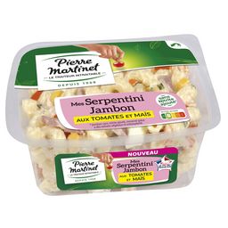 Une recette familiale et gourmande à base de Serpentini et accompagnée de jambon supérieur (Porc français), tomates et maïs.