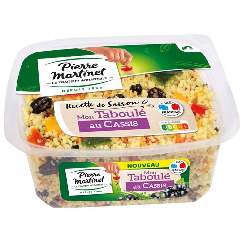 Ingrédients : semoule de blé dur réhydratée 45% (semoule de BLÉ dur, eau), légumes (poivrons, tomates, concombres), huile de colza, cassis infusé séché 5,1% (cassis, jus de pomme concentré, jus de citron concentré, huile de tournesol), échalote, ciboulette, épices, vinaigre d'alcool, sel, conservateur : sorbate de potassium.