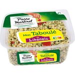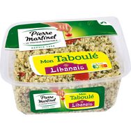 Ingrédients : boulghour réhydraté 30% (boulghour (BLE), eau), semoule de blé dur réhydratée 26% (eau, semoule de BLE dur), légumes 21% (tomates, oignons), jus de citron à base de concentré, persil 5,1%, huile d'olive vierge extra, huile de colza, menthe, épices, sel, conservateur : sorbate de potassium.
