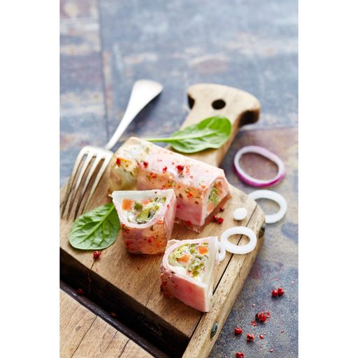 Une tranche de jambon supérieur à la texture délicate, roulée et fourrée à la macédoine de légumes dans une gelée fondante au bon goût cuisiné de bouillon de légumes.