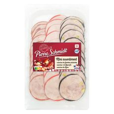 Un format de 30 mini-tranches composé de saucisse de Lyon (marquants de viande), de saucisse de Lyon fin (farce fine) et de saucisse de jambon pistachée.
