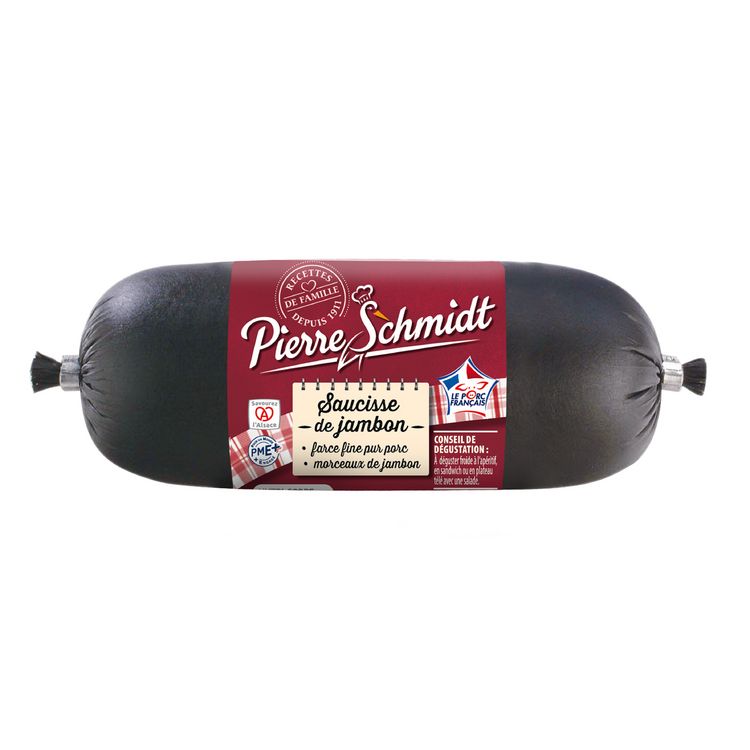 Une saucisse composée de farce fine pur porc et de morceaux de jambon en piécette.