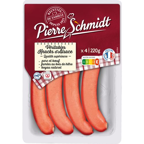 La reine des saucisses d’Alsace : une farce fine élaborée à partir de porc et de boeuf et un boyau naturel délicieusement croquant.