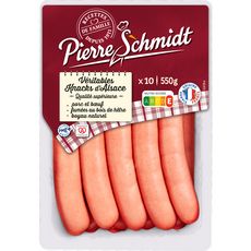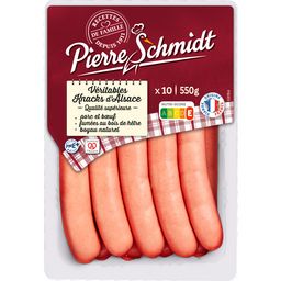 La reine des saucisses d’Alsace : une farce fine élaborée à partir de porc et de boeuf et un boyau naturel délicieusement croquant.