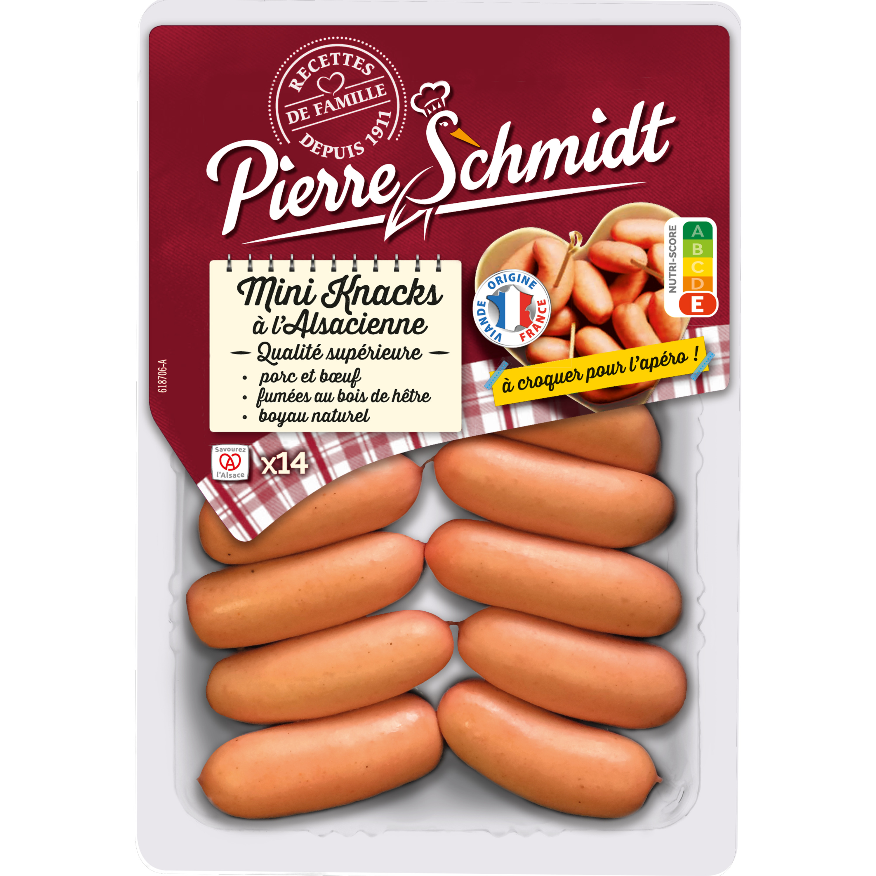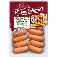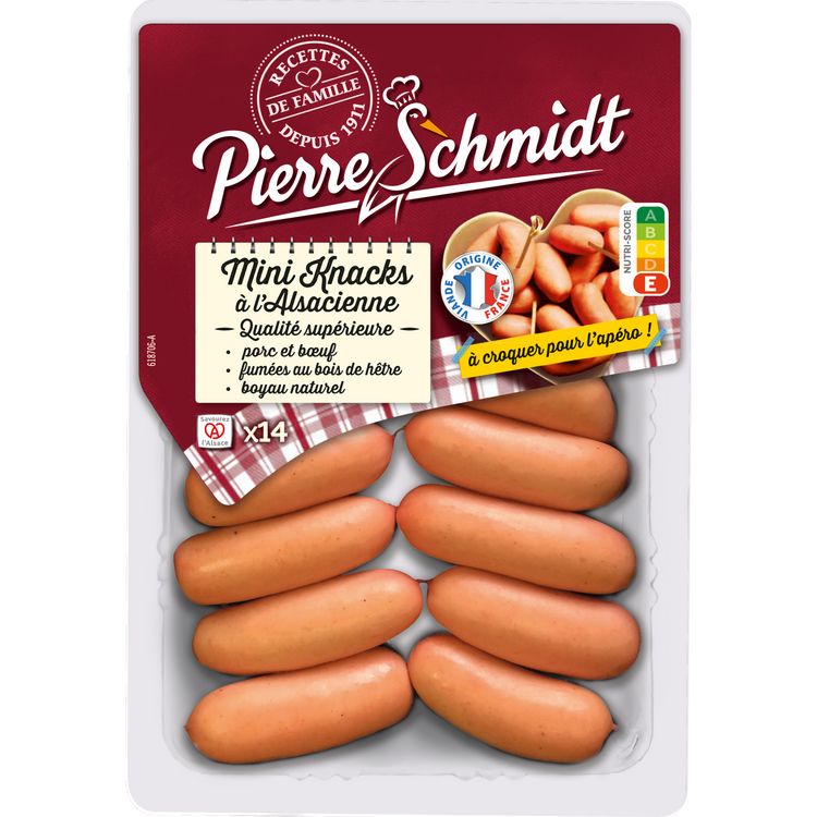 La véritable recette de Knacks Pierre Schmidt en version mini : une knack de qualité supérieure a base de viande de porc et de boeuf délicatement fumée au bois de hêtre.