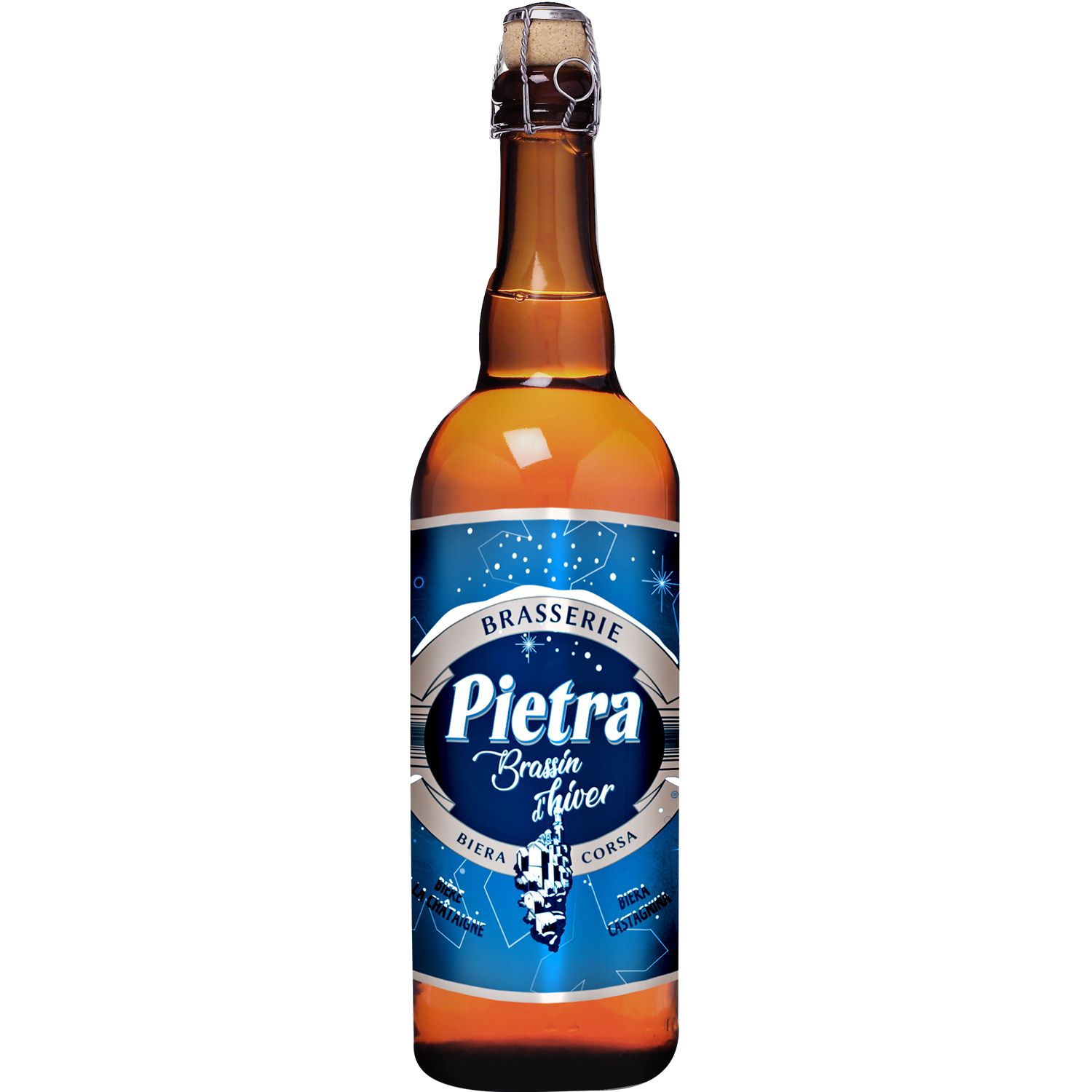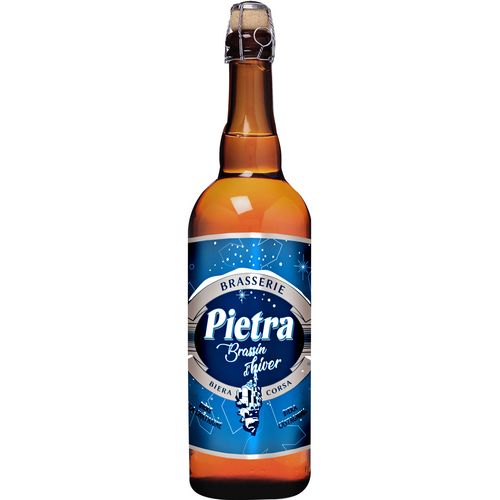 Bière Pietra Brassin d'Hiver 75cl 7° Farine de châtaigne, orge de Corse et une sélection de malts spéciaux, une recette exclusive développée par la Brasserie Pietra, pour une bière riche, charpentée, généreuse en bouche et à l'œil. Une bière aux notes de l'hiver, titrant à 7% d'alcool.